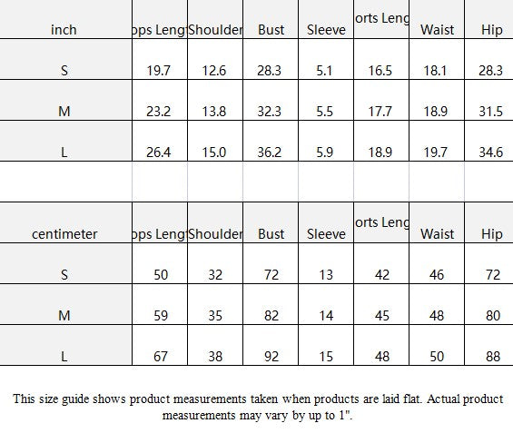 | inch | Tops Length | Shoulder | Bust | Sleeve | Shorts Length | Waist | Hip |