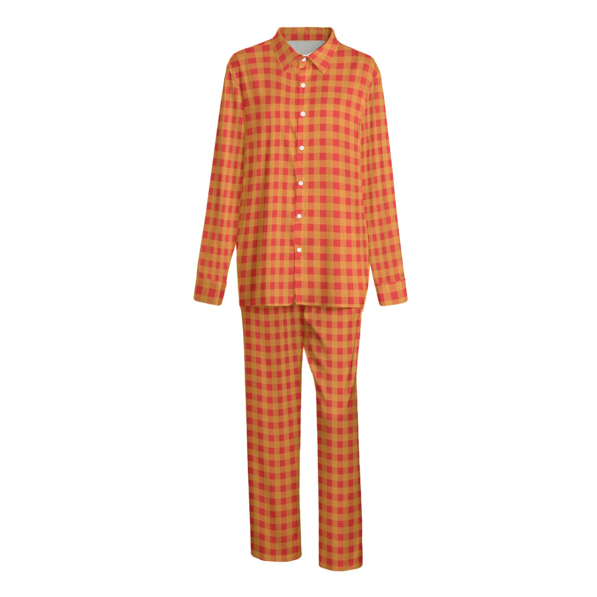 Red and Yellow Gingham Unisex Imitation Silk Shirt Suit