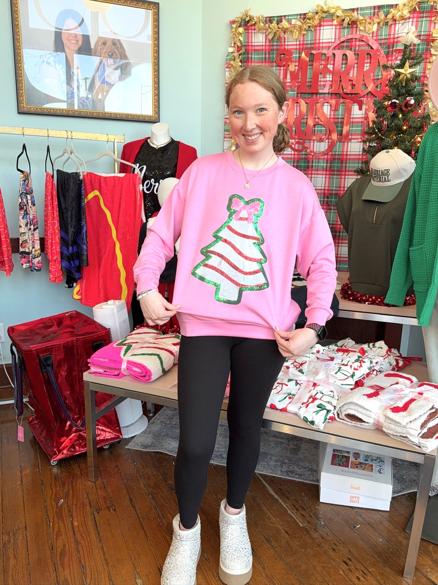 Pink sweatshirt with foil Christmas cake design with Christmas bow.